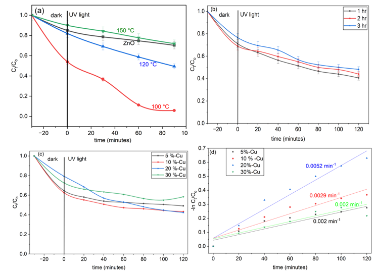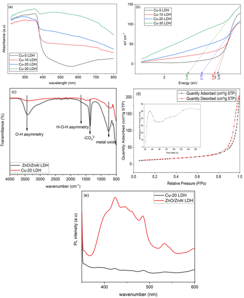 Figure 2c presents a comprehensive comparison of the photocatalytic abilities of ZnO/ZnAl LDH catalysts with varying Cu²⁺ substitution (5–30 %). A distinct relationship emerges between Cu content and degradation efficiency.