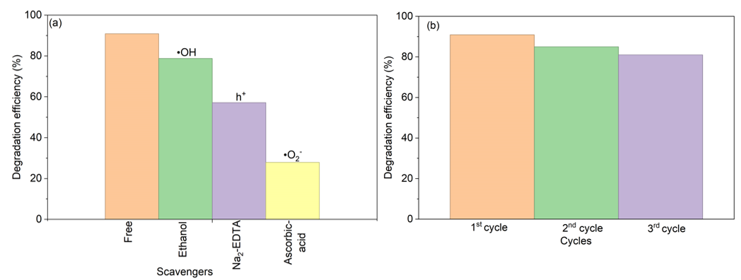 The catalyst’s reusability, assessed over three consecutive cycles (Figure 4b), retained over 80 % degradation efficiency, indicating excellent stability. This durability is likely due to the suppression of photo-corrosion [31] through efficient charge carrier separation during photocatalysis [29].