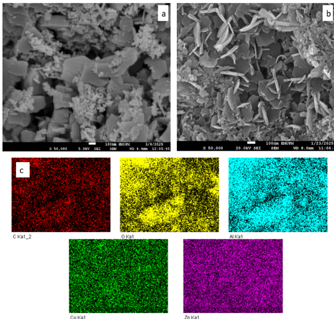 Using the same synthesis procedure, partial substitution of Zn²⁺ ions by Cu²⁺ ions was performed to prepare CuO/ZnO/ZnAl LDH samples with varying Cu loading levels from 5 to 30 mol%. The resulting samples were denoted as Cu-x LDH, where x represents the Cu content (5, 10, 20 and 30%).