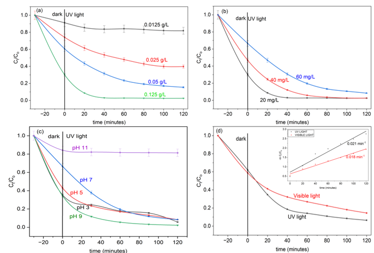 The effects of operational parameters on degradation performance were systematically investigated, including catalyst dosage (0.0125–0.125 g/L), initial dye concentration (20–60 mg/L), and solution pH (3–11).