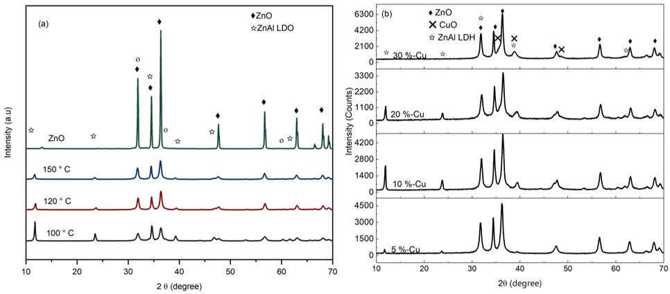 Using the same synthesis procedure, partial substitution of Zn²⁺ ions by Cu²⁺ ions was performed to prepare CuO/ZnO/ZnAl LDH samples with varying Cu loading levels from 5 to 30 mol%. The resulting samples were denoted as Cu-x LDH, where x represents the Cu content (5, 10, 20 and 30%).